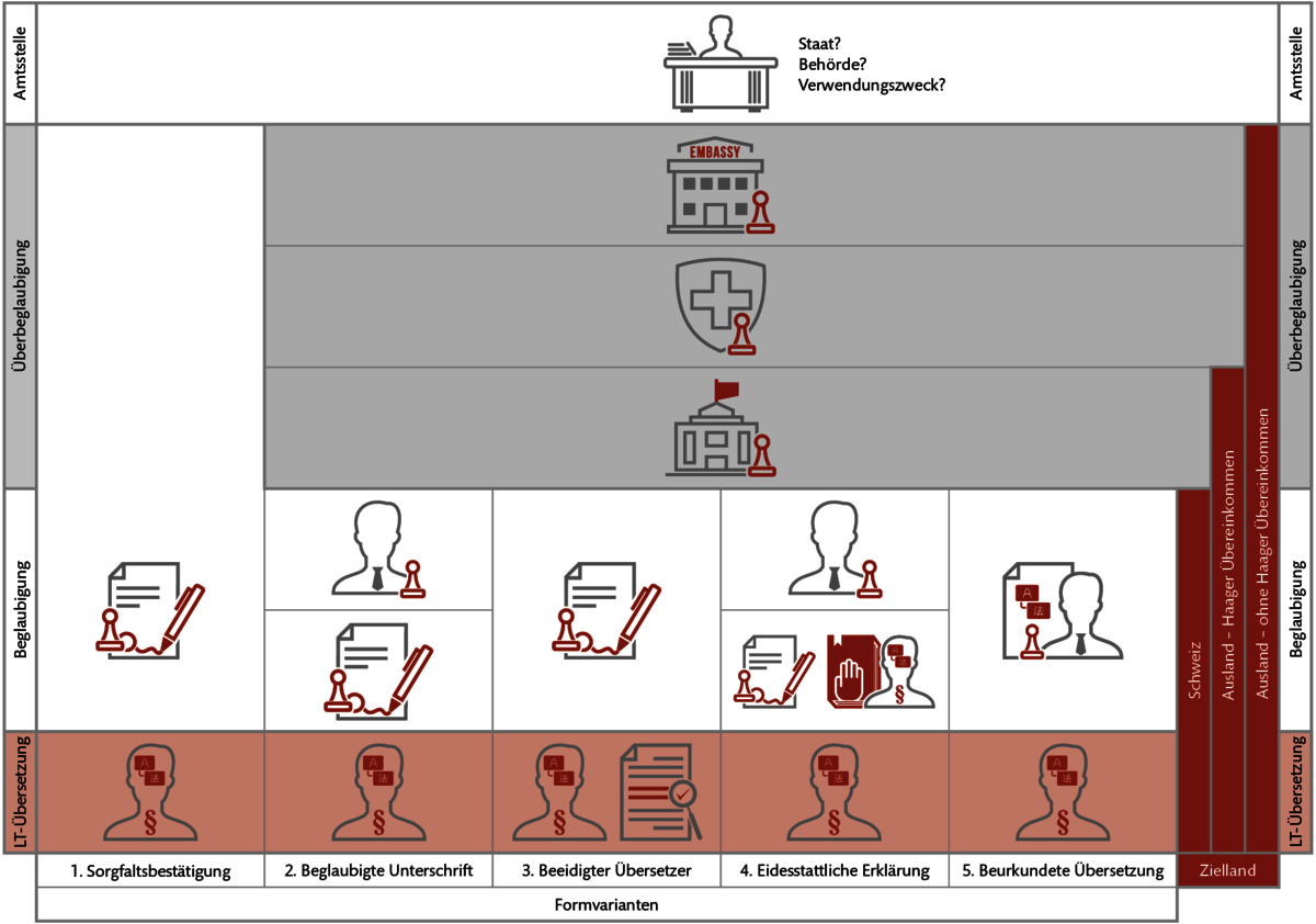 Das Translingua-Legal-Team in Bern kennt sich mit den je nach Rechtsordnung unterschiedlichen formellen Anforderungen an Übersetzungen für den amtlichen Gebrauch bestens aus. Wir unterscheiden folgende fünf Formvarianten: